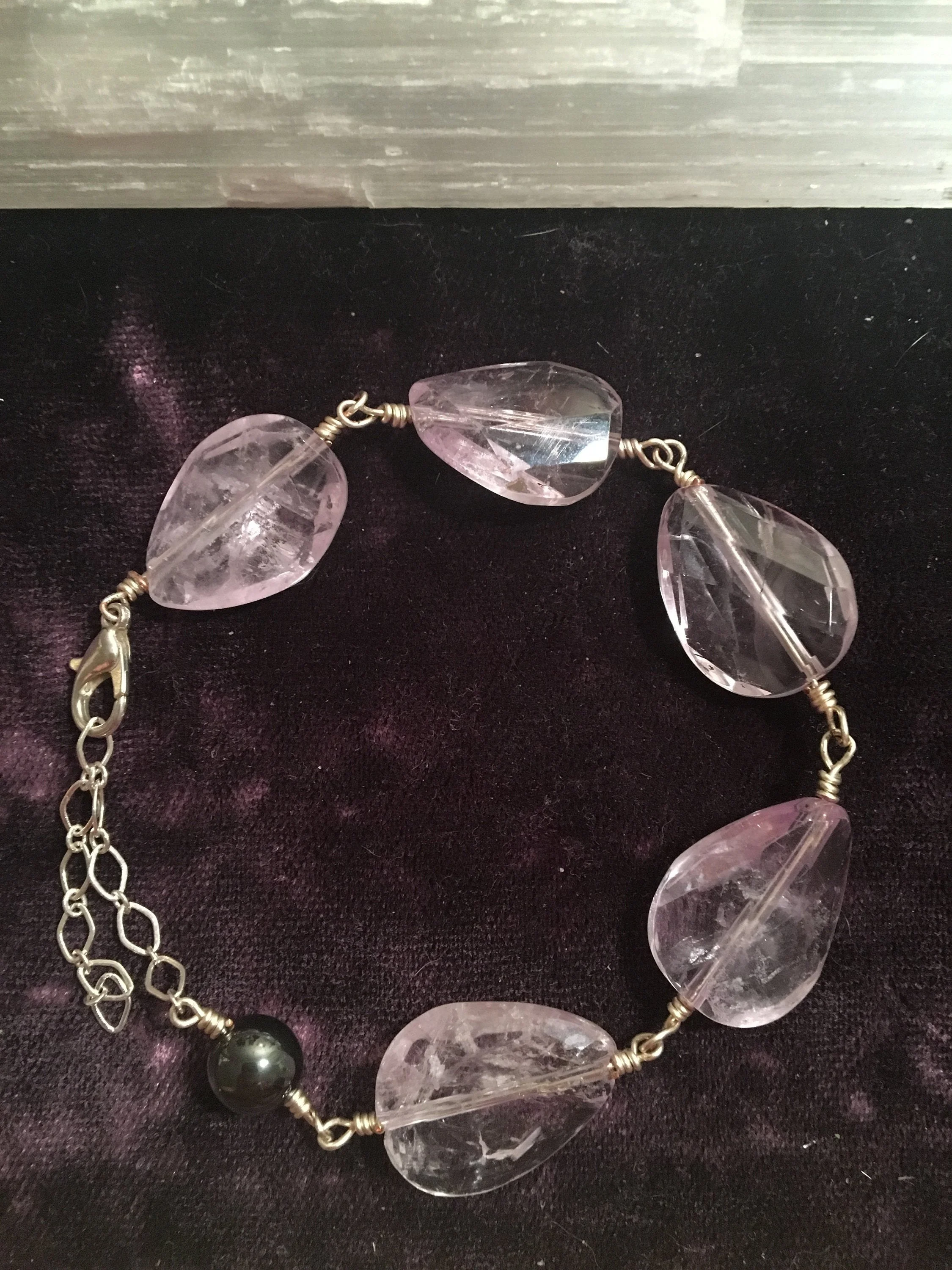 Translucent and faceted amethyst crystals feel silky and energizing to the wearer.