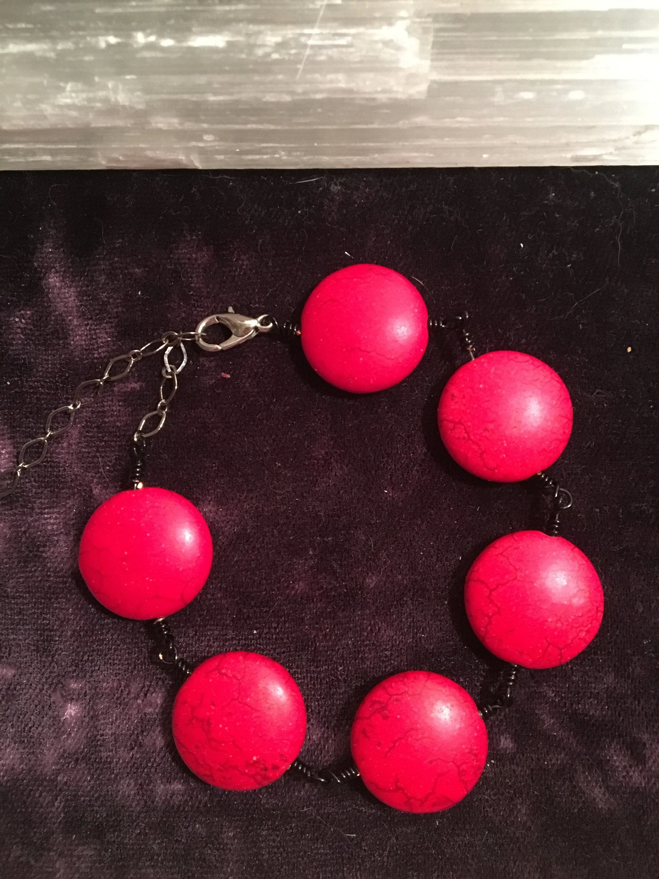 This wire-wrapped bracelet is made with red Howlite coins and comes with a 2-inch chain to adjust length.