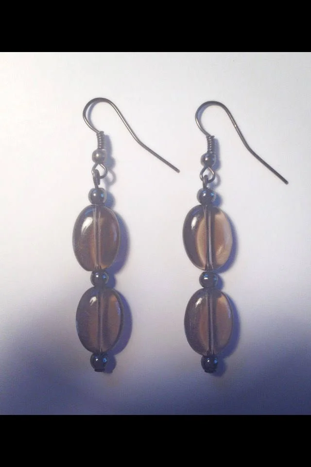 These earrings feature Smoky Quartz and Hematite beads. They are two inches long with metal-plated surgical steel ear wires.